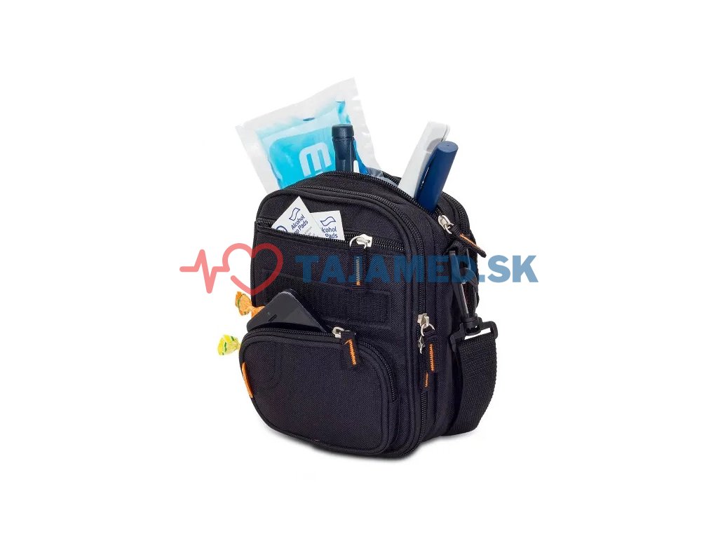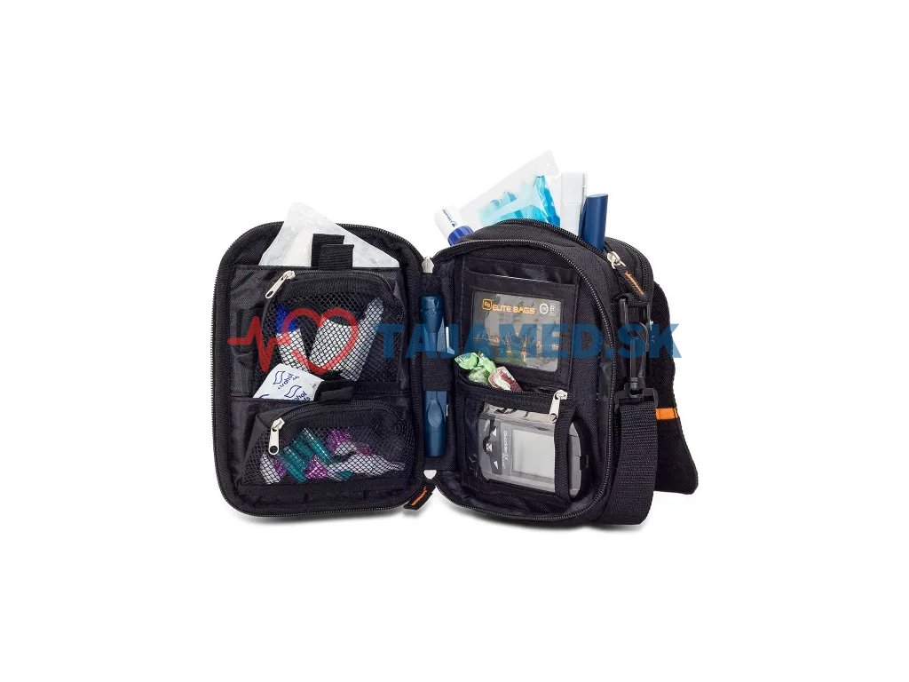 - Predné priehradky obsahujúce viacero vreciek na organizáciu a uloženie materiálov potrebných na liečbu cukrovky a osobných potrieb.